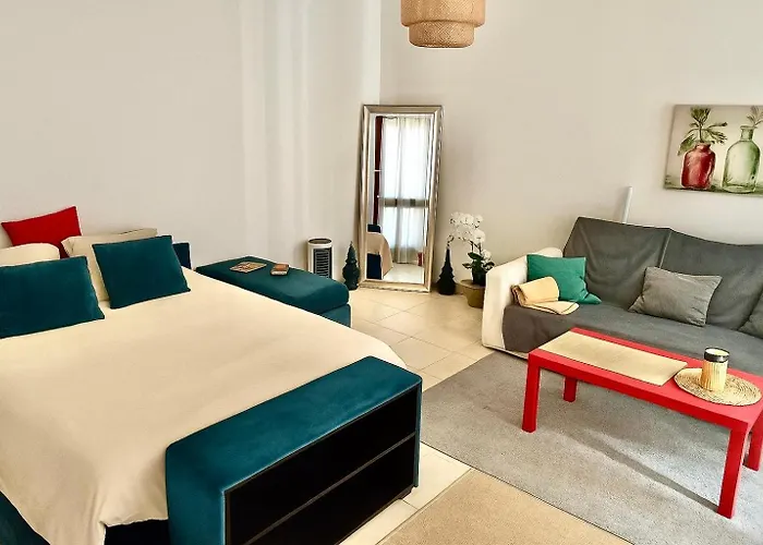 ベッドルーム1室のAppartement Avec Balcon, Piscine Et Garage Prive ペルピニャンはテラスがあり、テアトル・ド・ラルシペルから1.5キロメートルに位置しています。 長い一日を過ごした後は、プールでひと泳ぎしてリラックスできます。